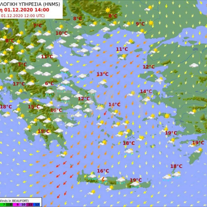 Θερμοκρασία: Από 11 έως 17 βαθμούς Κελσίου. Στις Κυκλάδες η μέγιστη 2 με 3 βαθμούς χαμηλότερη.