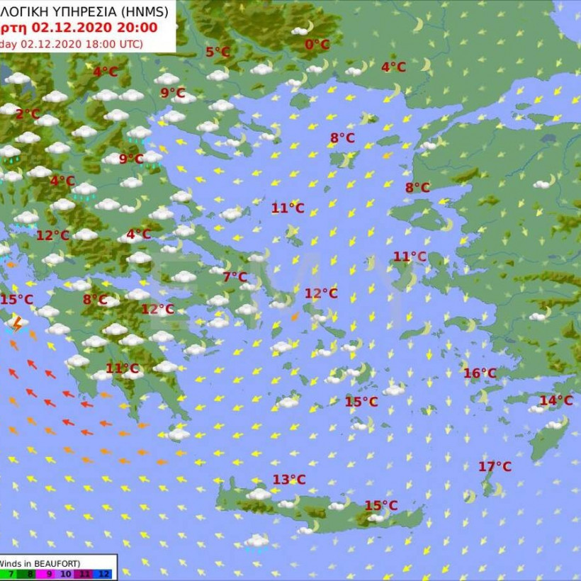 Οι άνεμοι θα πνέουν, στα δυτικά νότιοι νοτιοανατολικοί 5 με 6 στο Ιόνιο 7 και πρόσκαιρα έως 8 μποφόρ. Στα ανατολικά από ανατολικές διευθύνσεις 3 με 5 και βαθμιαία στο Αιγαίο τοπικά 6 μποφόρ.