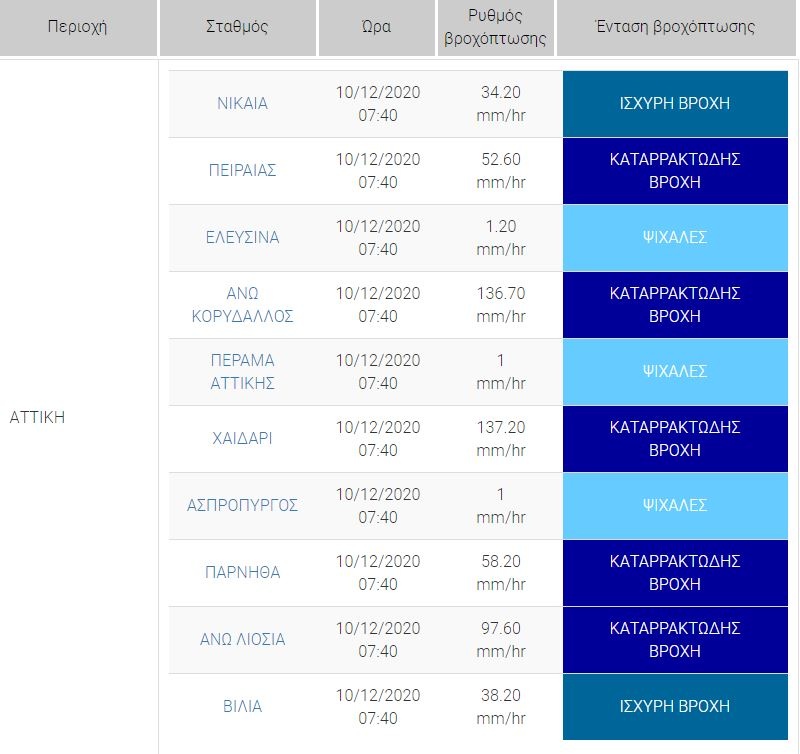 Σύμφωνα με την πρόγνωση του meteo.gr αυτή την ώρα βρέχει καταρρακτωδώς στον Πειραιά, Άνω Κορυδαλλό, Χαϊδάρι, Πάρνηθα και Άνω Λιόσια.