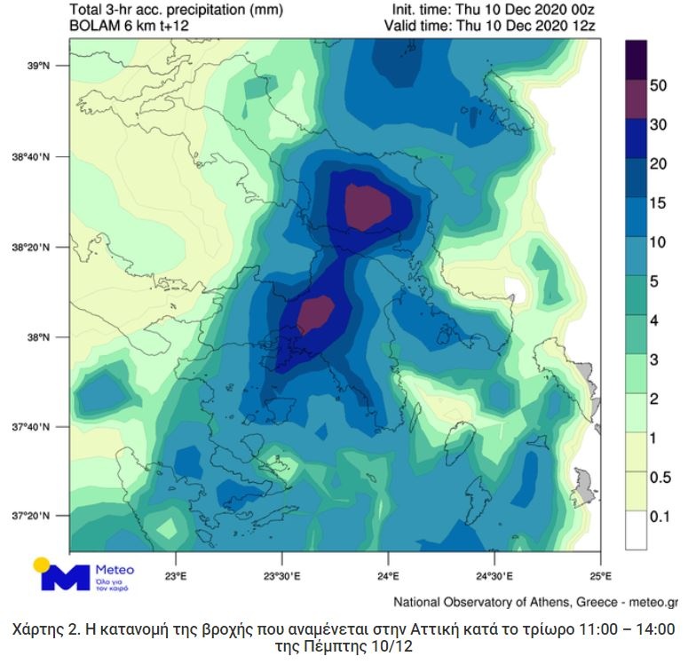 Ισχυρές βροχοπτώσεις και σποραδικές καταιγίδες αναμένονται κατά τόπους και στην Αττική, κατά το διάστημα από το πρωί έως νωρίς το απόγευμα. Στο Χάρτη 2 παρουσιάζεται χαρακτηριστικά η κατανομή της βροχής που αναμένεται κατά το τρίωρο 11:00 – 14:00 της Πέμπτης 10/12.