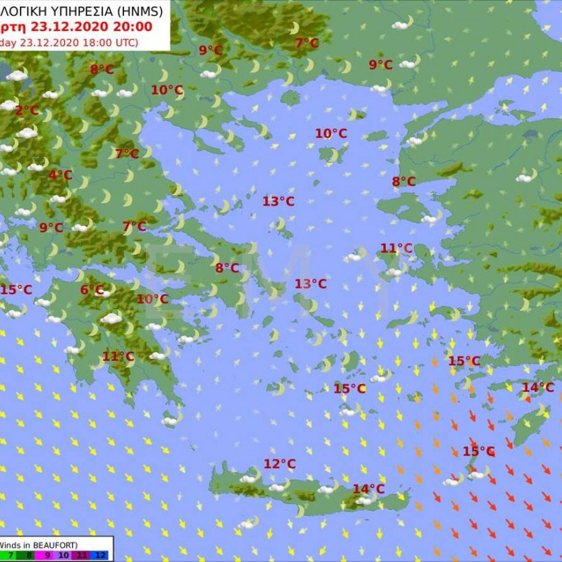 Θερμοκρασία: Από 02 έως 15 βαθμούς Κελσίου. Στη δυτική Μακεδονία και τη Θράκη η μέγιστη 2 με 3 βαθμούς χαμηλότερη.