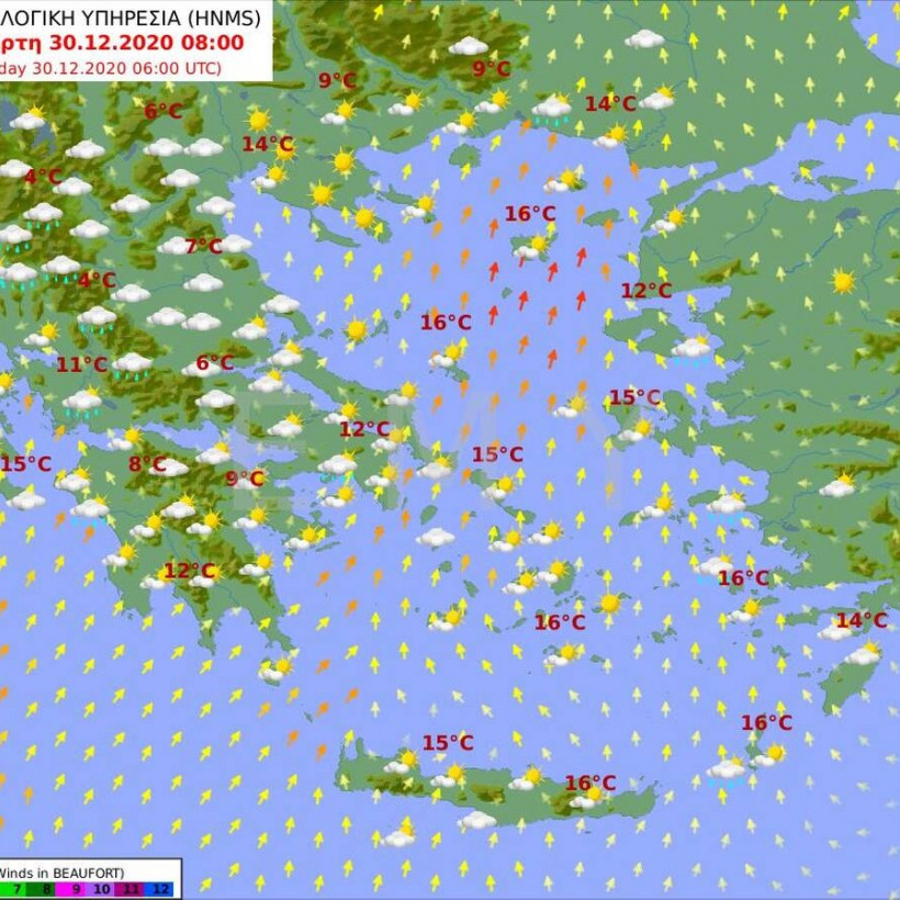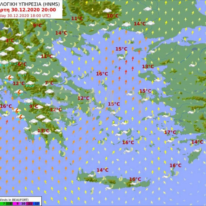 Άνεμοι: Νότιοι νοτιοδυτικοί 4 με 6, στο βόρειο Ιόνιο 7 και μέχρι το απόγευμα τοπικά 8 μποφόρ.