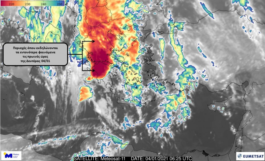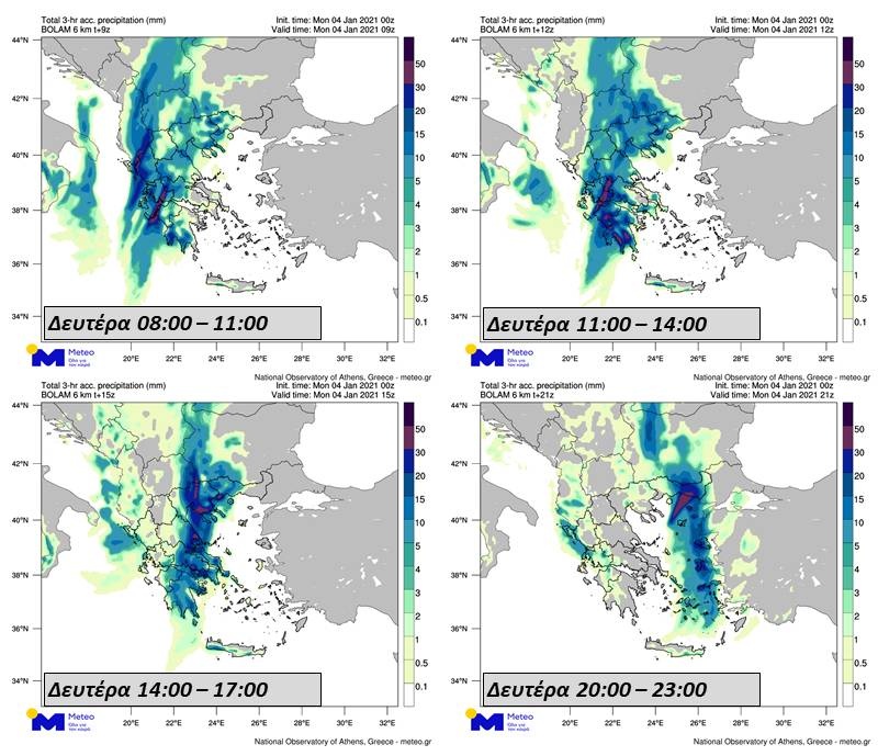 και της Αττικής), την ανατολική Μακεδονία, την Εύβοια, τις Σποράδες και πρόσκαιρα τη Θεσσαλία με εξασθένηση των φαινομένων αργά τη νύχτα της Δευτέρας (04-01-2021)