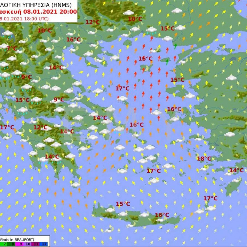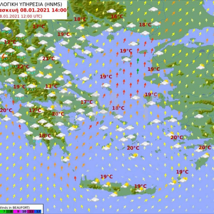 Οι άνεμοι θα πνέουν από νότιες διευθύνσεις 4 με 6 και στο Αιγαίο 7 με 8 μποφόρ, στρεφόμενοι βαθμιαία στα δυτικά, κεντρικά και τα βόρεια σε βορείων διευθύνσεων 4 με 6 μποφόρ.