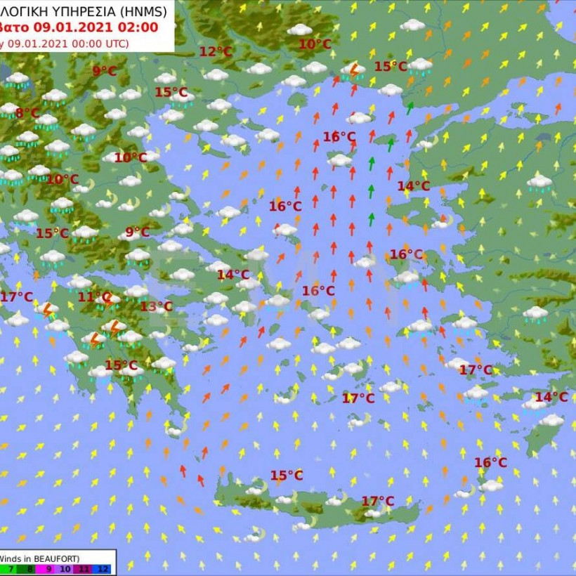 Άνεμοι: Νότιοι νοτιοδυτικοί 3 με 5, στα ανατολικά 6 με 7 και βαθμιαία στο Θρακικό τοπικά έως 8 μποφόρ.