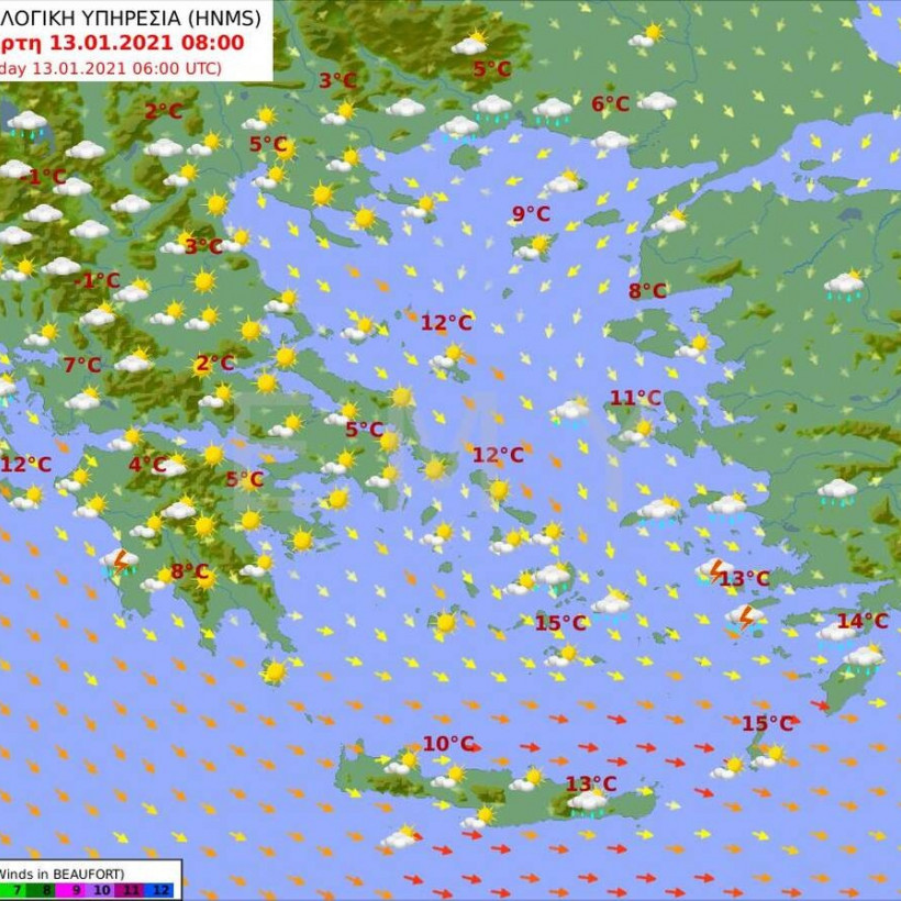 Σύμφωνα με το Έκτακτο Δελτίο Επιδείνωσης Καιρού που εκδόθηκε τη Δευτέρα 11 Ιανουαρίου 2021 από την Εθνική Μετεωρολογική Υπηρεσία (ΕΜΥ), επιδείνωση παρουσιάζει ο καιρός με ισχυρές βροχές και καταιγίδες που θα συνοδεύονται κατά τόπους από χαλαζοπτώσεις και θυελλώδεις νότιους ανέμους εντάσεως 7 με 8 μποφόρ.