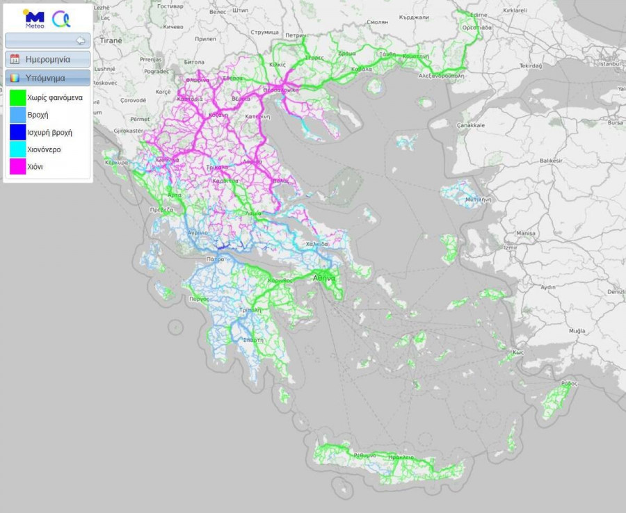 Ο συνδυασμός των χιονοπτώσεων με τις αρνητικές θερμοκρασίες θα διαμορφώσουν κατά τόπους επικίνδυνες συνθήκες οδήγησης. Για τον λόγο αυτό σας προτρέπουμε να συμβουλεύεστε την υπηρεσία μας «ΣΥΝΘΗΚΕΣ ΟΔΙΚΟΥ ΔΙΚΤΥΟΥ» στο σχεδιασμό των οδικών σας μετακινήσεων. Στον χάρτη που ακολουθεί παρουσιάζονται οι συνθήκες που αναμένονται κατά τις πρώτες ώρες της Παρασκευής 15/1. Με μωβ χρώμα φαίνονται τα σημεία του δικτύου όπου αναμένονται χιονοπτώσεις και με ανοικτό γαλάζιο τα σημεία όπου αναμένεται χιονόνερο.