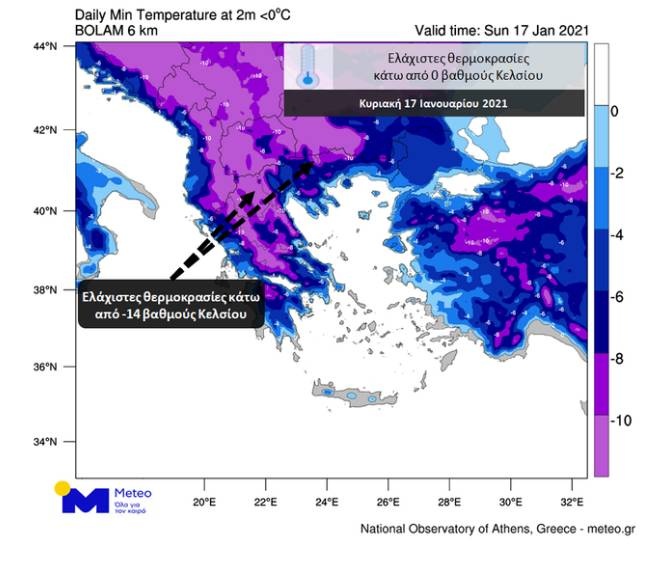 Στο χάρτη που ακολουθεί παρουσιάζεται η ελάχιστη θερμοκρασία που αναμένεται την Κυριακή 17/1: