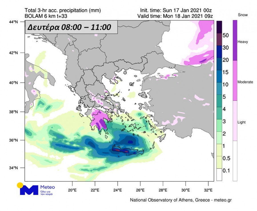 Σύφμωνα με το meteo.gr, πρόκειται για την τρίτη φάση της κακοκαιρίας «Λέανδρος», η οποία θα έχει ως κύρια χαρακτηριστικά τις πυκνές κατά τόπους χιονοπτώσεις στα κεντρικά και νότια ηπειρωτικά και στα ορεινά της Κρήτης καθώς και τις ισχυρές βροχοπτώσεις στις νότιες νησιωτικές και παράκτιες περιοχές.