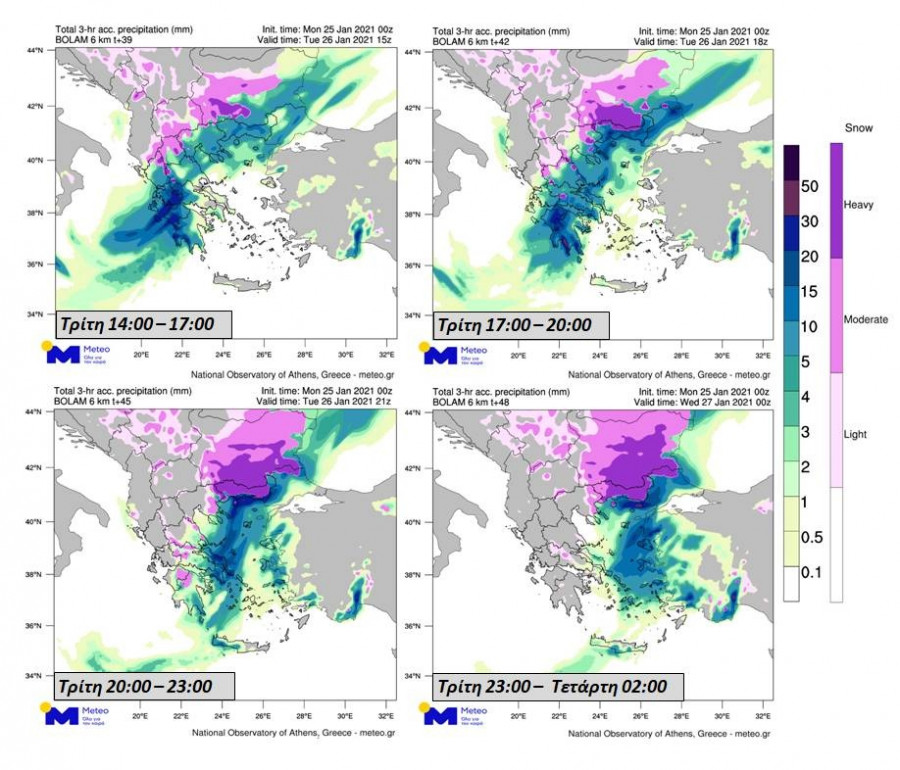 Στους χάρτες που ακολουθούν παρουσιάζεται ενδεικτικά ο ολικός υετός (βροχή/χιόνι) που αναμένεται σε τέσσερα τρίωρα από το μεσημέρι της Τρίτης 26/1 έως τις πρώτες ώρες της Τετάρτης.