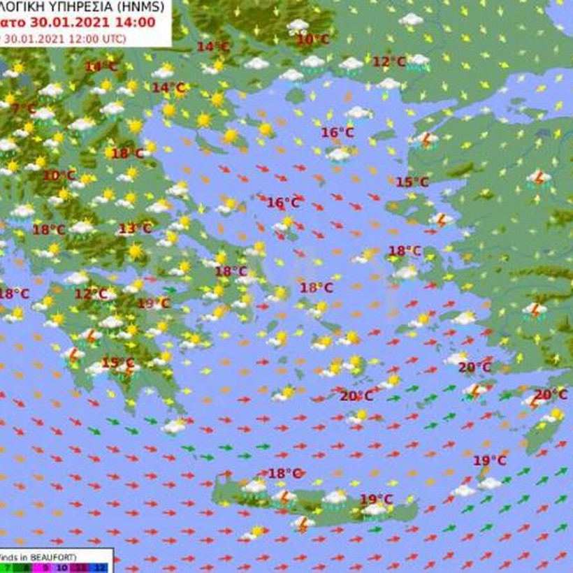 Οι άνεμοι πνέουν νοτιοδυτικοί 5 με 7 και στο νότιο Αιγαίο πρόσκαιρα 8 μποφόρ, στρεφόμενοι βαθμιαία από τις προμεσημβρινές ώρες σε δυτικούς βορειοδυτικούς, με σταδιακή εξασθένηση.