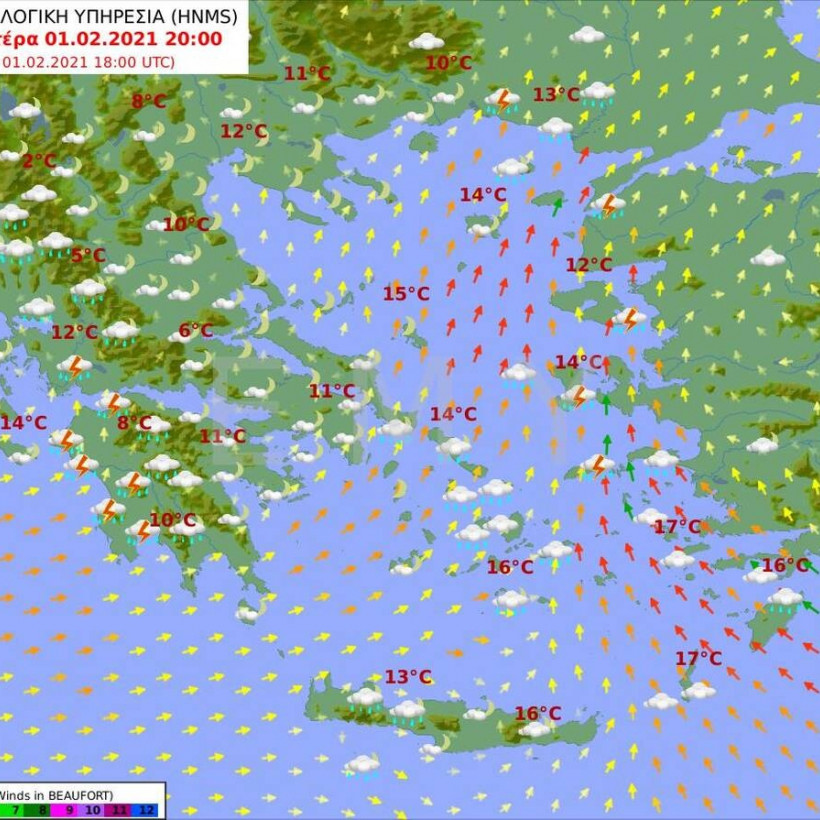 Άνεμοι: Από νότιες διευθύνσεις 7 με 8 και τοπικά 9 μποφόρ, με μικρή εξασθένηση το βράδυ στα βόρεια.