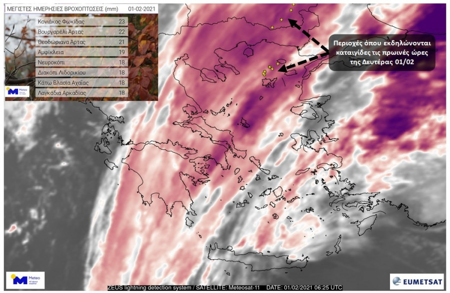 Στη δορυφορική εικόνα που ακολουθεί διακρίνονται οι νεφώσεις πάνω από τη χώρα στις 08:30 το πρωί και με κίτρινους αστερίσκους επισημαίνονται οι καταιγίδες, ενώ εμπεριέχεται πίνακας με τις σημαντικότερες βροχοπτώσεις έως την ίδια ώρα, όπως αυτές καταγράφηκαν από το δίκτυο αυτόματων μετεωρολογικών σταθμών του Εθνικού Αστεροσκοπείου Αθηνών/meteo.gr.