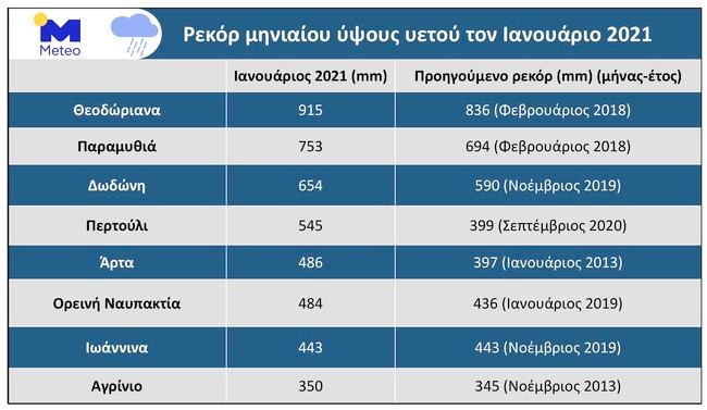 Στον Πίνακα παρουσιάζονται μερικές ενδεικτικές τιμές-ρεκόρ μηνιαίου ύψους υετού σε χιλιοστά τον Ιανουάριο 2021, καθώς και τα αμέσως προηγούμενα ρεκόρ.