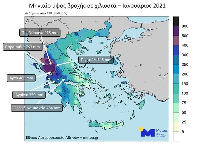 Καιρός: Πολύ μεγάλα ύψη υετού (βροχή και χιόνι) κατέγραψε το δίκτυο των μετεωρολογικών σταθμών του Εθνικού Αστεροσκοπείου Αθηνών/meteo.gr τον Ιανουάριο 2021.