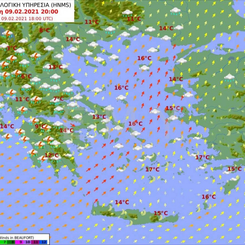 Οι άνεμοι θα πνέουν στα δυτικά και νότια νοτιοανατολικοί 3 με 5 και βαθμιαία 6 μποφόρ. Στα υπόλοιπα βόρειοι βορειοανατολικοί 5 με 7 ενισχυόμενοι στο βόρειο Αιγαίο τη νύχτα σε 8 μποφόρ.