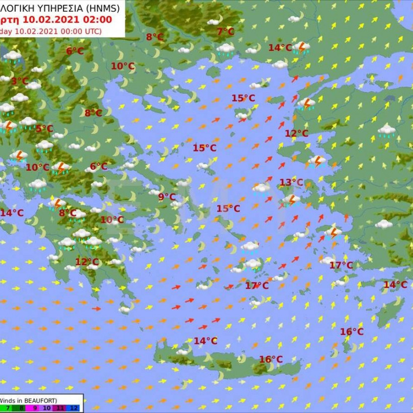 β. Από τις βραδινές ώρες, μέχρι τις πρώτες πρωινές ώρες της Τετάρτης (10-02-2021) τα νησιά του ανατολικού Αιγαίου και πιθανώς η Θράκη.
