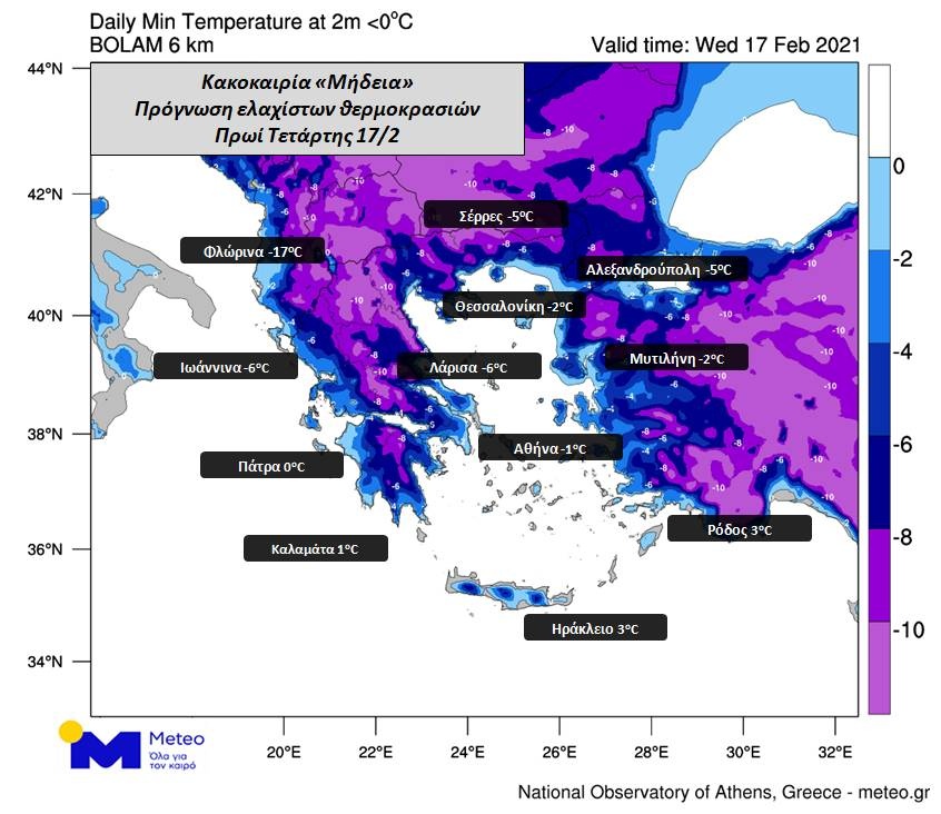 Στον χάρτη που ακολουθεί παρουσιάζονται οι περιοχές όπου η ελάχιστη θερμοκρασία που αναμένεται το πρωί της Τετάρτης 17/2 θα πέσει κάτω από μηδέν βαθμούς Κελσίου καθώς και οι ελάχιστες θερμοκρασίες για επιλεγμένες πόλεις της χώρας.