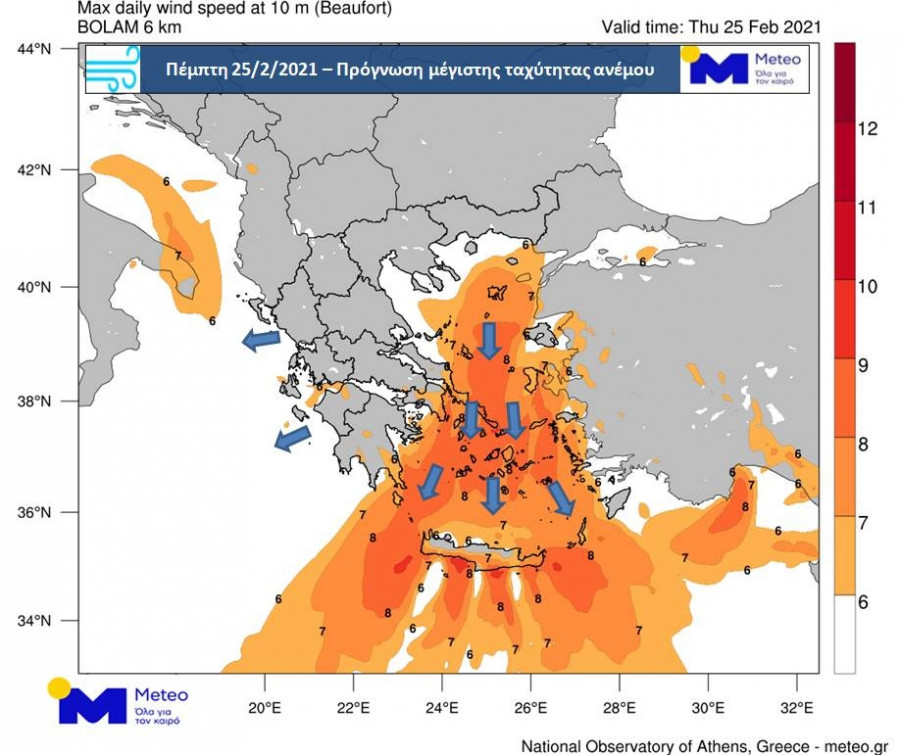 Σύμφωνα με τα τελευταία προγνωστικά δεδομένα του Εθνικού Αστεροσκοπείου Αθηνών / meteo.gr, την Πέμπτη 25/2 στο Αιγαίο θα επικρατήσουν βόρειοι άνεμοι εντάσεως 6 έως 8 μποφόρ, ενώ νότια της Κρήτης θα φτάνουν κατά τόπους και τα 9 μποφόρ.