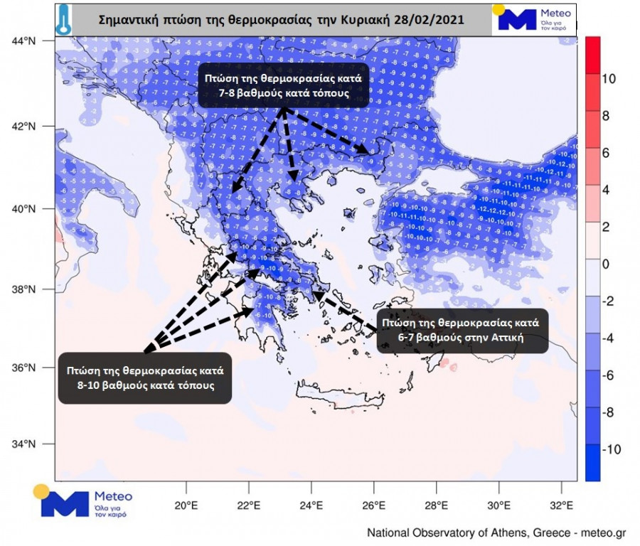 Σύμφωνα με τα προγνωστικά στοιχεία του Εθνικού Αστεροσκοπείου Αθηνών/meteo.gr, οι μέγιστες θερμοκρασίες την Κυριακή θα υποχωρήσουν σε σχέση με εκείνες του Σαββάτου έως και κατά δέκα βαθμούς κατά τόπους, ενώ ειδικότερα στην Αττική κατά έξι έως επτά βαθμούς σε σχέση με χθες.