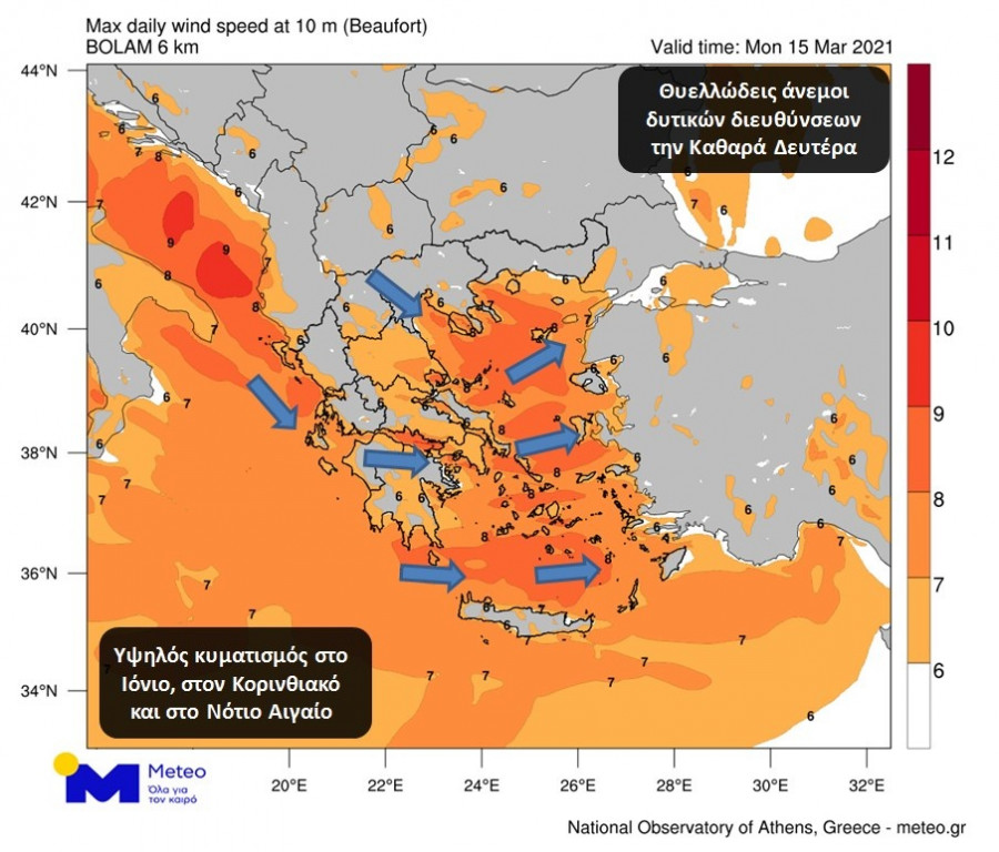 Ανεμοι: Νότιοι νοτιοδυτικοί 3 με 4, που βαθμιαία από το απόγευμα θα στραφούν σε δυτικούς, ενώ το βράδυ θα γίνουν βορειοδυτικοί και θα ενισχυθούν σε 5 με 6 μποφόρ.