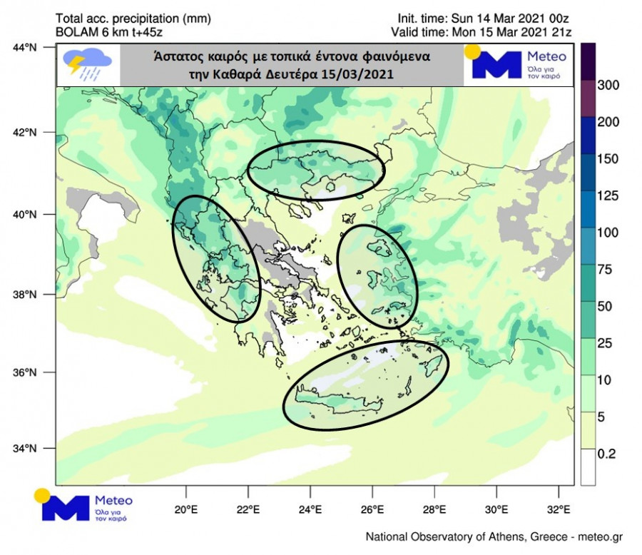 Σύμφωνα με τα νεότερα προγνωστικά στοιχεία του Εθνικού Αστεροσκοπείου Αθηνών/meteo.gr, την Καθαρά Δευτέρα 15/03/2021 βροχές και σποραδικές καταιγίδες θα εκδηλωθούν σε πολλές περιοχές της χώρας, με τα φαινόμενα κατά τόπους να είναι έντονα. Χιονοπτώσεις θα εκδηλωθούν στα ορεινά ηπειρωτικά (έως τα 900 περίπου μέτρα) καθώς και σε περιοχές της Δυτικής Μακεδονίας και της Ηπείρου με χαμηλότερο υψόμετρο.