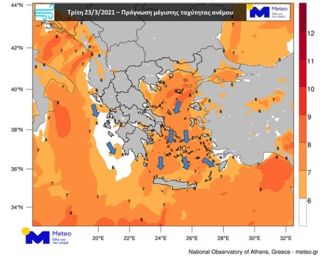 Καιρός: Συνεχίζεται η κακοκαιρία την Τρίτη 23/03, σύμφωνα με τα τελευταία προγνωστικά δεδομένα του Εθνικού Αστεροσκοπείου Αθηνών / meteo.gr.