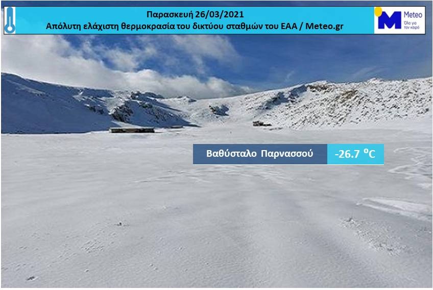 Τις πρωινές ώρες της Παρασκευής 26/3, η ελάχιστη θερμοκρασία στο Βαθύσταλο έφτασε τους -26,7 βαθμούς Κελσίου, μια θερμοκρασία που παραπέμπει σε άλλη εποχή και σε άλλο γεωγραφικό πλάτος.