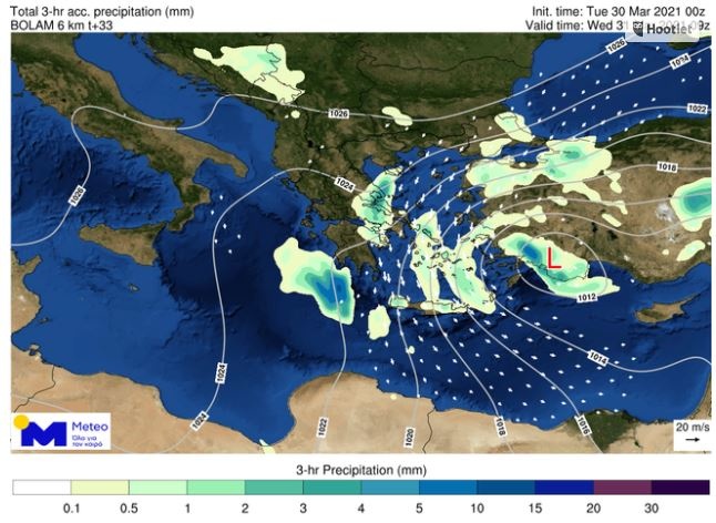Καιρός: Βαρομετρικό χαμηλό στο Νοτιοανατολικό Αιγαίο, αναμένεται να επηρεάσει τον καιρό της χώρας το διήμερο Τετάρτη 31/03 και Πέμπτη 01/04 με βροχές και καταιγίδες στα ανατολικά και νότια ηπειρωτικά, στις Κυκλάδες, στην Κρήτη και στα Δωδεκάνησα, φαινόμενα που κατά τόπους θα είναι ισχυρά.