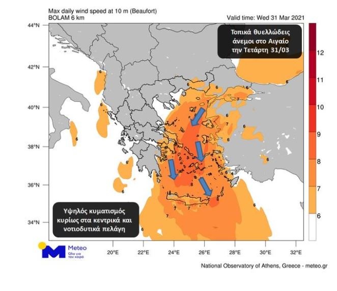 Όσον αφορά στους ενισχυμένους ανέμους κατά τη διάρκεια της Τετάρτης 31/03, στον προγνωστικό χάρτη που ακολουθεί, παρουσιάζονται με βέλη οι επικρατούσες διευθύνσεις των ανέμων, ενώ οι κόκκινες αποχρώσεις και οι αναγραφόμενες τιμές αποτυπώνουν τις εκτιμώμενες μέγιστες εντάσεις τους.