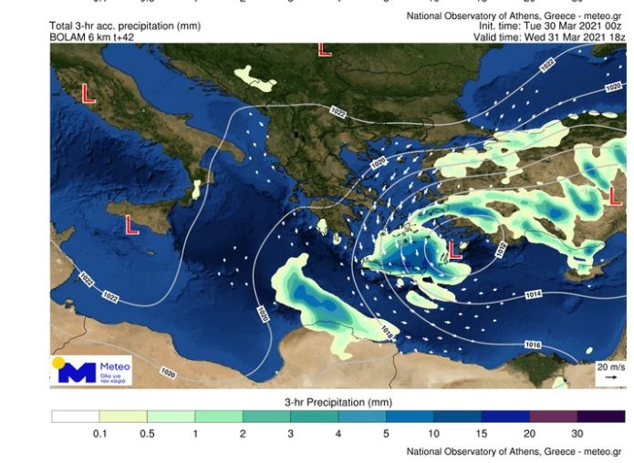 Βαρομετρικό χαμηλό στο Νοτιοανατολικό Αιγαίο, αναμένεται να επηρεάσει τον καιρό της χώρας το διήμερο Τετάρτη 31/03 και Πέμπτη 01/04 με βροχές και καταιγίδες στα ανατολικά και νότια ηπειρωτικά, στις Κυκλάδες, στην Κρήτη και στα Δωδεκάνησα, φαινόμενα που κατά τόπους θα είναι ισχυρά.