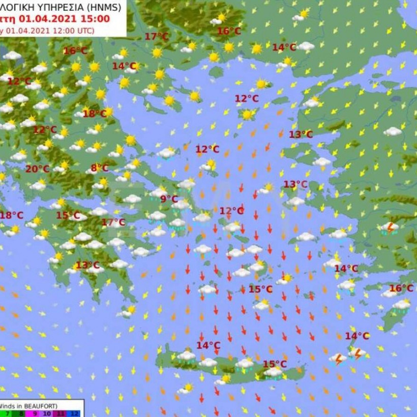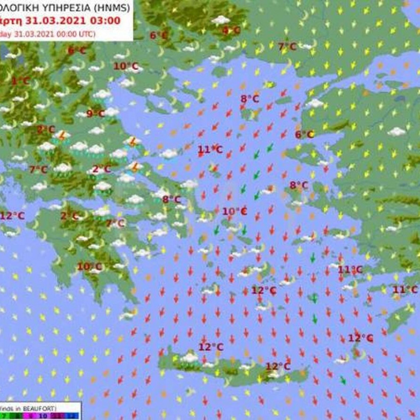 Οι άνεμοι θα πνέουν, στα δυτικά από ανατολικές διευθύνσεις 3 με 5, στα ανατολικά από βόρειες διευθύνσεις 7 με 8 και τοπικά στο Αιγαίο 9 μποφόρ.