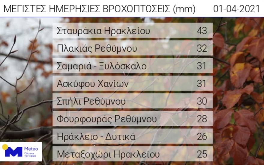 Παράλληλα, όπως αναμενόταν, σημαντικές βροχοπτώσεις έχουν εκδηλωθεί στην Κρήτη. Στον πίνακα που ακολουθεί παρουσιάζονται τα οκτώ μεγαλύτερα ύψη βροχόπτωσης έως τις 09:30 το πρωί.