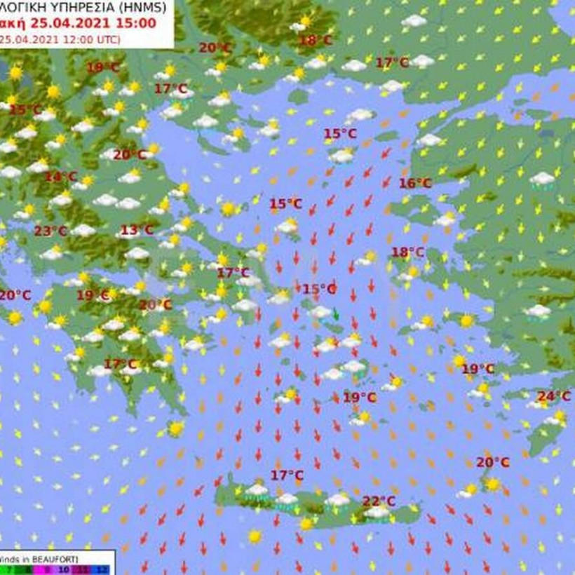 Οι άνεμοι πνέουν ανατολικοί βορειοανατολικοί 4 με 6, στα νότια τοπικά 7 και βαθμιαία έως 8 μποφόρ.
