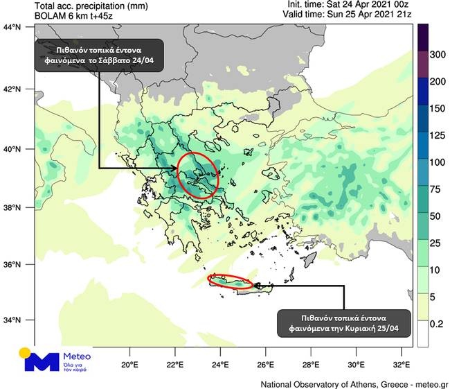 Το αθροιστικό ύψος βροχόπτωσης για το Σαββατοκύριακο 24/04 – 25/04, παρουσιάζεται στον παρακάτω χάρτη