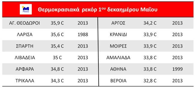 Σύμφωνα με τα τελευταία προγνωστικά στοιχεία του Εθνικού Αστεροσκοπείου Αθηνών / meteo.gr από τη Μ. Πέμπτη 29/04 οι μέγιστες θερμοκρασίες αναμένεται να ξεπεράσουν σε αρκετές περιοχές τους 30 βαθμούς και τοπικά στην Κρήτη να φτάσουν στους 35 βαθμούς, ενώ το διήμερο Μ. Σάββατο και την Κυριακή του Πάσχα οι μέγιστες θερμοκρασίες σε αρκετές περιοχές θα ξεπεράσουν τους 33-34 βαθμούς Κελσίου. Με βάση την υπάρχουσα εικόνα είναι πολύ πιθανό να σημειωθούν νέα θερμοκρασιακά ρεκόρ. Στους πίνακες που ακολουθούν, παρουσιάζονται επιλεγμένα θερμοκρασιακά ρεκόρ του παρελθόντος για το μήνα Απρίλιο (πίνακας 1) και για το πρώτο δεκαήμερο του Μαΐου (πίνακας 2), όπως έχουν καταγραφεί είτε από το δίκτυο μετεωρολογικών σταθμών του Εθνικού Αστεροσκοπείου Αθηνών, είτε από την Εθνική Μετεωρολογική Υπηρεσία.