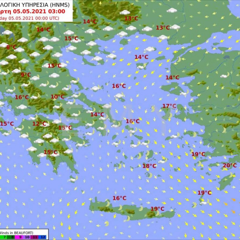 Άνεμοι: Στα νησιά του ανατολικού Αιγαίου βορειοανατολικοί 4 με 6 και τις πρωινές ώρες τοπικά 7 μποφόρ, με βαθμιαία εξασθένηση από το απόγευμα. Στα Δωδεκάνησα βορειοδυτικοί 4 με 6 μποφόρ.