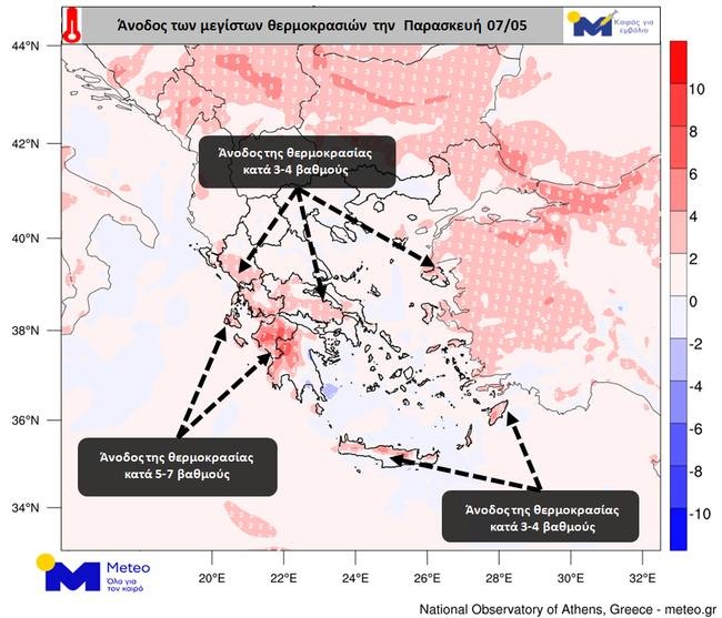 Καιρός: Σύμφωνα με τα προγνωστικά στοιχεία του Εθνικού Αστεροσκοπείου Αθηνών / Meteo.gr, την Παρασκευή 07/05 η θερμοκρασία αναμένεται να παρουσιάσει άνοδο η οποία θα είναι γενικά της τάξης των 3-4 βαθμών Κελσίου.