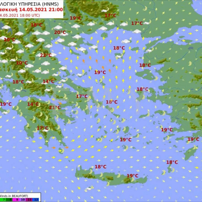 Οι άνεμοι θα πνέουν δυτικοί βορειοδυτικοί 4 με 6 και στα νότια τοπικά έως 7 μποφόρ.