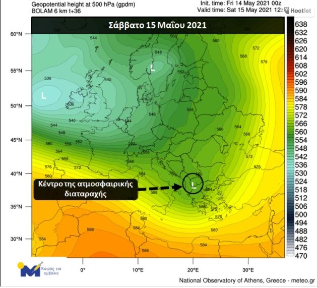 Η θέση της ατμοσφαιρικής διαταραχής το μεσημέρι του Σαββάτου 15/05