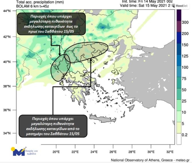 Τα φαινόμενα θα εντοπίζονται κατά κύριο λόγο στα δυτικά, κεντρικά και βόρεια ηπειρωτικά και στο Βόρειο Ιόνιο και Αιγαίο. Παράλληλα, θα σημειωθεί πτώση της θερμοκρασίας κατά 3 έως 7 βαθμούς ως προς τις μέγιστες τιμές της, η οποία θα γίνει περισσότερο αισθητή στα κεντρικά και βόρεια ηπειρωτικά. Παρακάτω παρουσιάζεται ο ολικός υετός (βροχές/καταιγίδες) που αναμένεται έως το βράδυ του Σαββάτου 15/05 καθώς και οι περιοχές όπου υπάρχει μεγαλύτερη πιθανότητα εκδήλωσης καταιγίδων.