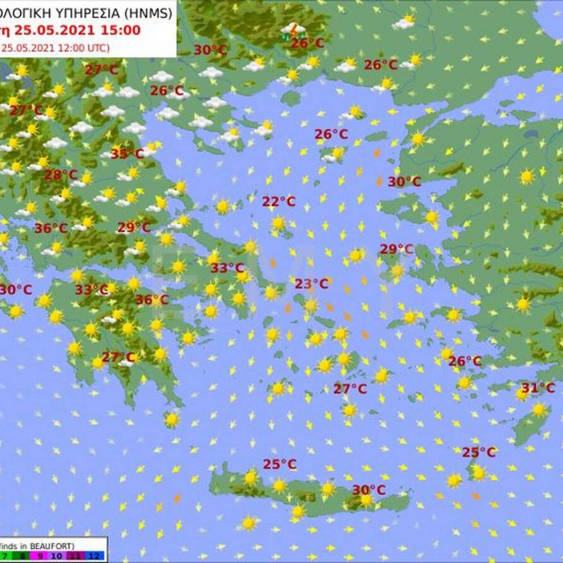 Θερμοκρασία: Από 16 έως 29 βαθμούς και στη νότια Κρήτη έως 33 βαθμούς Κελσίου.