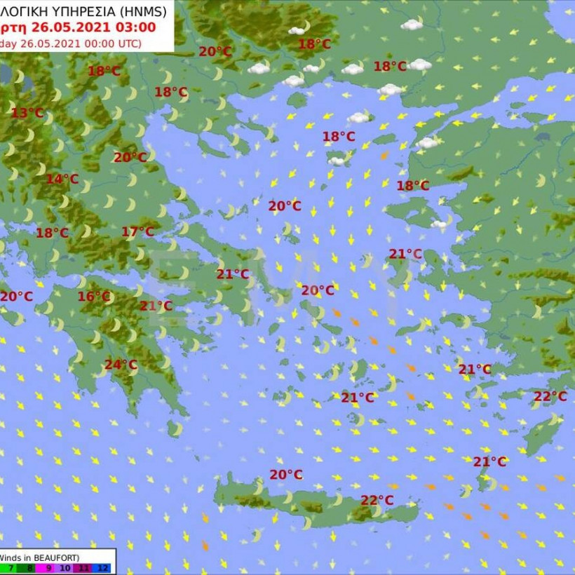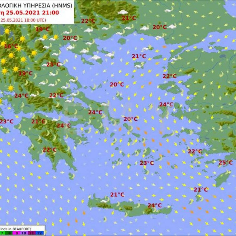 Άνεμοι: Από βόρειες διευθύνσεις 3 με 4 και στα ανατολικά τοπικά 5 μποφόρ.