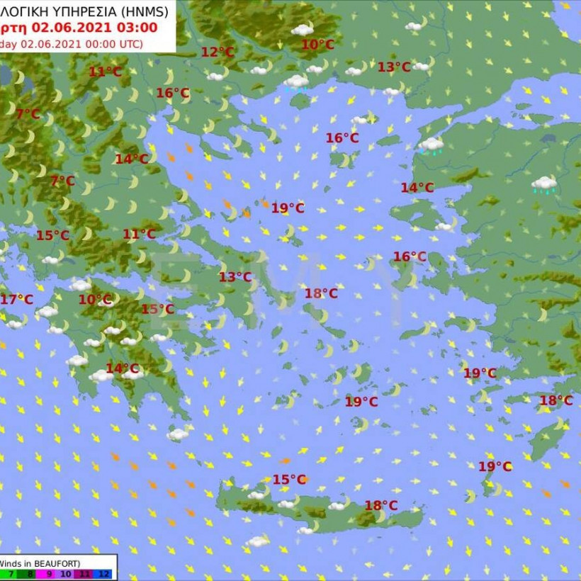 Οι άνεμοι θα πνέουν δυτικοί βορειοδυτικοί 3 με 5 και στα δυτικά και τα νότια τοπικά 6 μποφόρ.