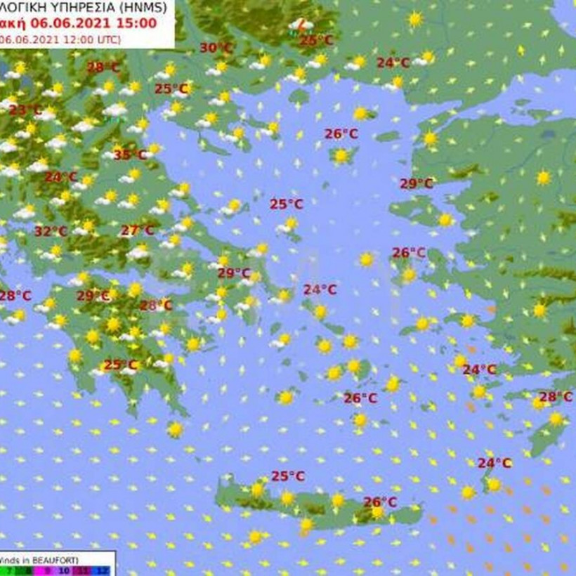 Θερμοκρασία: Από 13 έως 31 και στη Θράκη έως 28 βαθμούς Κελσίου. Στη δυτική Μακεδονία η ελάχιστη 3 με 4 βαθμούς χαμηλότερη.