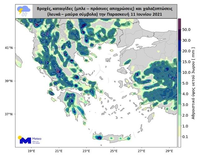 Στον προγνωστικό χάρτη που ακολουθεί αποτυπώνονται με μπλε-πράσινες αποχρώσεις οι περιοχές όπου θα εκδηλωθούν βροχές ή καταιγίδες τις μεσημεριανές και απογευματινές ώρες της Παρασκευής και με κουκίδες επισημαίνονται οι περιοχές όπου εντοπίζεται η μεγαλύτερη πιθανότητα εκδήλωσης χαλαζοπτώσεων κατά τη διάρκεια της ημέρας. Οι μαύρες κουκίδες απεικονίζουν χαλάζι με μεγέθη έως 2 εκατοστά, ενώ οι λευκές κουκίδες δείχνουν πού αναμένονται μεγάλες ποσότητες χαλαζιού.