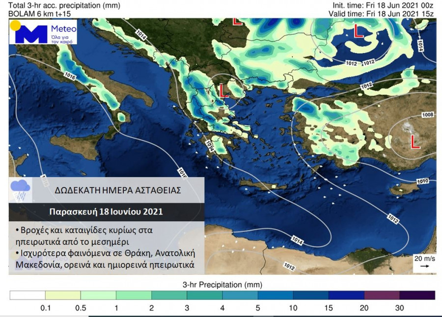 Δείτε στον χάρτη που ακολουθεί τα ύψη βροχής που αναμένονται για το τρίωρο 15:00 - 18:00 της Παρασκευής 18/06.