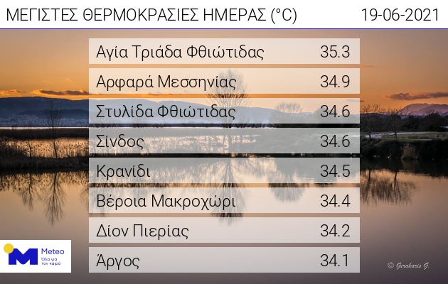 Το Σάββατο (19/6), η θερμοκρασία έφτασε τοπικά ακόμα και τους 35 βαθμούς Κελσίου. Οι υψηλότερες μέγιστες θερμοκρασίες, όπως καταγράφηκαν από το δίκτυο των αυτόματων μετεωρολογικών σταθμών του Εθνικού Αστεροσκοπείου Αθηνών/meteo.gr, ήταν στην Αγία Τριάδα Φθιώτιδας (35,3), στα Αρφαρά Μεσσηνίας (34,9), στη Στυλίδα Φθιώτιδας (34,6), στη Σίνδο (34,6) και στο Κρανίδι (34,5).