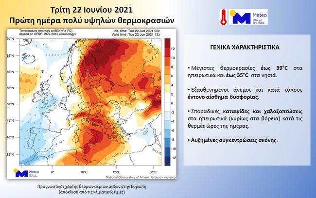 Σύμφωνα με τα προγνωστικά στοιχεία του Εθνικού Αστεροσκοπείου Αθηνών / meteo.gr, την Τρίτη 22/06 οι μέγιστες θερμοκρασίες αναμένεται να φτάσουν στα ηπειρωτικά τους 38-39 βαθμούς, ενώ τοπικά ο υδράργυρος δεν αποκλείεται να αγγίξει και τους 40 βαθμούς Κελσίου. Χαμηλότερα θα διατηρηθούν οι θερμοκρασίες στα νησιωτικά τμήματα όπου οι μέγιστες θα συγκρατηθούν στους 33-35 βαθμούς.