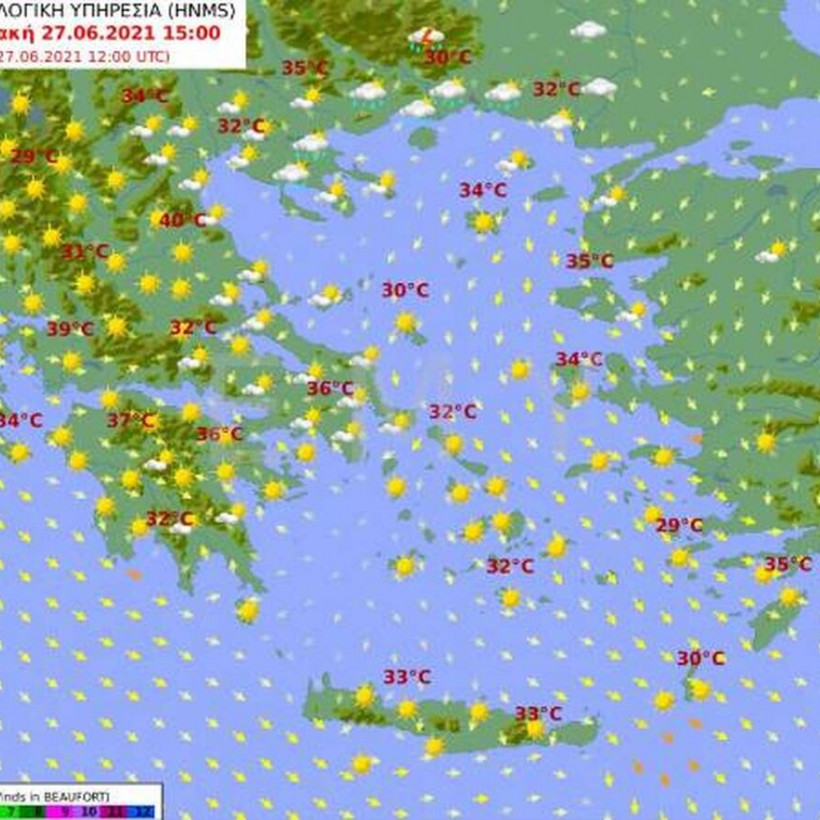 Θερμοκρασία: Από 22 έως 40 και κατά τόπους 41 βαθμούς Κελσίου. Στα νησιά και τα παραθαλάσσια η μέγιστη 2 με 4 βαθμούς χαμηλότερη.